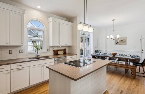 Entering the home you will notice the beautiful light, hardwood floors, large windows, and classic design. Off the right of the entrance is a half bath. Guests will love the large gourmet kitchen featuring quartz countertops and stainless steel appliances including a Jenn-Air fridge and flat-top stove. The kitchen is fully stocked with plenty of festive, outdoor dinnerware specifically for dining on the pool deck, as well as, more formal tableware for your indoor dining. The formal dining area is located right off of the kitchen and there is enough seating for 10-12, which makes this home ideal for a holiday dinner or family celebration. Off the dining room is your living room with a sectional sofa and a love seat chair plus a 70"Samsung TV mounted over the fireplace. Additionally, the den off of the kitchen has a sleeper sofa, desk, and 50” TV, which is great for additional sleeping arrangements or getting some work done in your home away from home.