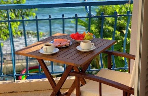 The building of 'Psarou Thalassa Studios' consists of 12 self catering studios in total and is located in front of the beach. The beach is sandy and awarded with a blue flag by the EU. All studios (including those of the ground floor) overlook the blue ionian sea. Each studio has a surface of 25 sq. meters and can accommodate up to 3 persons (1 double bed & 1 single bed per studio). Every studio has kitchen, refrigerator, TV, A/c, private WC and private balcony. The 12 studios are suitable for 12 couples, families with children and groups up to 36 persons. All 12 studios are independent, they are not connected with interior doors. The sea is safe for small children (no big waves or deep waters). The nearest restaurant is in a distance of 200 m.