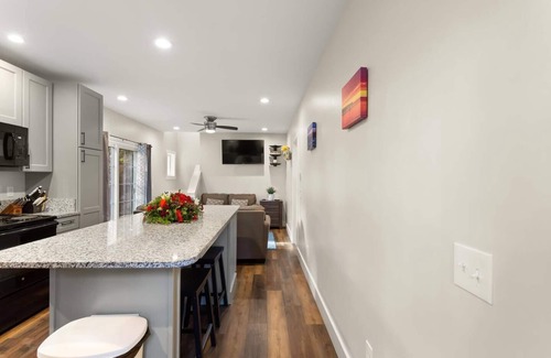 The open concept home allows for a living area and a large eat-in kitchen with island, soft close cabinets, granite counters and vinyl laminate flooring. All new appliances include a side by side refrigerator, electric range, dishwasher, and microwave. The living area offers comfortable seating, flat screen TV with cable, DVD player and a sliding glass door.