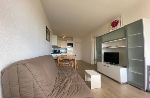 Living room with 2-seater sofa bed (140x190), TV, opening onto west balcony with furniture,