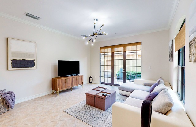 This platinum 2 bedroom , 2 bathroom newly renovated condo features many upgraded amenities . The home has high speed Wi-Fi and multiple streaming networks. The master bedroom has a new king bed with upgraded linens and home office space . The master bathroom has large walk- in closet and shower. The guest bedroom features a queen bed , with extra luxury queen and twin inflatable mattresses. Both bedrooms have smart TV's and luxury linens through- out the home . The great room features a formal dining room , breakfast bar seating, 55 inch smart tv and queen sleeper sofa. The sunny lanai features view of beautiful grounds , picnic area , and pool. The chef's kitchen includes new appliances and is fully equipped for your stay. This unit has full laundry services. The building has a full service elevator and a small stairway directly to the front of the unit . Property manager available with rental concierge assistance and property refences. Condo is in walking distance to many local restaurants, Starbucks, Publix, and great entertainment.