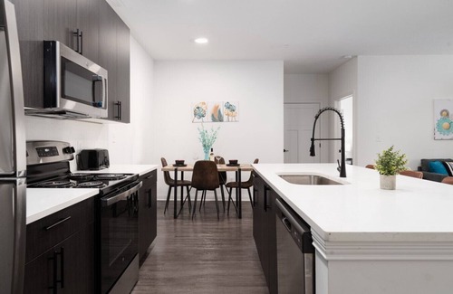 Additional features include a full-size washer and dryer, built-in desk for remote work, fiber internet, and smart thermostats for your convenience.