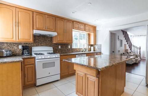 There are four bedrooms and three bathrooms in the house. The master bedroom with a queen bed has in suite bathroom with shower. The two guest bedrooms each has a queen, and 4th guest room has a Twin bed & another pull-out bed under. We also have an extra Twin bed with pull-out bed on the 2nd floor living room for additional guests. Full kitchen with an island and a dining room table sit 6 comfortably. Smart TV in the modern living room with comfortable sofas. Huge parking lot behind the building can allow you to park up to 4 cars.