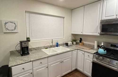 Stay and get all the comforts of home! Features Queen-sized bed in one bedroom, one single bed on second bedroom and a sofa bed in the living room. You're going to love this open kitchen and living room concept. Also, features flat screen TV, Dining table for 4, Refrigerator, Oven, Stove, wifi, washer and dryer for your convenience! And a fenced backyard!