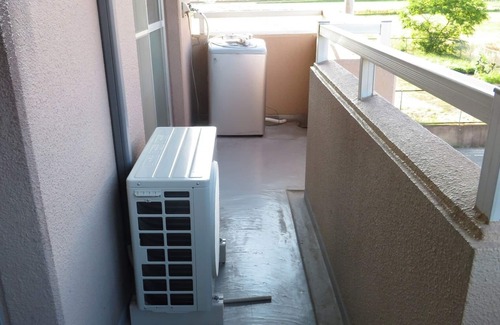 There are two air conditioners a washing machine on the balcony and two 4m poles