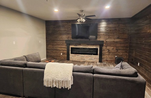 Inside, enjoy a large entertainment/theater room and a game room complete with a dartboard for fun nights in. Outside, gather around the fire pit or unwind in the hammock while enjoying the peaceful surroundings. With the lake just a stone's throw away and additional lake access nearby, you'll have plenty of opportunities for water activities. Starlink included.