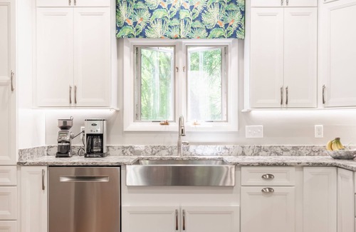 The whole house is newly decorated with a colorful, fun beach theme throughout. Enter the main living area and enjoy the large windows showcasing the tropical scenic foliage. The space offers a comfortable sofa, mounted flat screen TV and access to the deck. The fully equipped kitchen has white and navy cabinets, granite counter tops, and stainless steel appliances. Adjacent to the kitchen is the dining table that seats six. There is a 2nd living space off the entry that has small couch with chaise lounge. Enjoy the gorgeous views from the porch, that seats 4, or the deck that's equipped with a gas grill and has steps leading to the back yard. A half bath completes the common space.