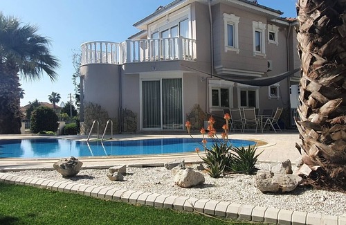 A beautiful 3 double bedroomed villa, set in its own landscaped gardens with a own private use swimming pool, measuring 4 feet deep and 9metres long. Just 30 minutes from Antalya international airport in Belek on the Turkish Riviera, with 17 international golf courses nearby. Beautifully furnished throughout with everything that you need to enjoy a relaxing sun drenched holiday. It is a 25 minute walk to the nearby beach at Belek with golden sands, restaurants and water sports and a 20 minute walk to the resort centre of Belek with a large selection of shops and restaurants and bars.