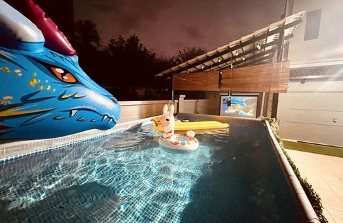 This huge Semi-D is the perfect family escape. This space accommodates up to 15+ pax and has everything to make you feel at home–WiFi, Netflix, washer , queen size bed, well equipped kitchen, tableware, BBQ pit, PS4, KTV and disco living room, home theater speaker system and your own 5 meter pool.