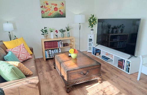 Bright and peaceful 2nd floor unit. Master bedroom comes with a queen size bed. Second bedroom a full size bed. Living room is furnished with a new leather couch. Both bedroom windows are furnished with blackout curtains and blinds. Living room has a 75 inch LG smart TV. Electric was updated with all new outlets and switches throughout the apartment. Bathroom was recently remodeled. Kitchen comes with a brand new range/oven. Unit has newer luxury vinyl plank flooring throughout. Kitchen is fully stocked with everything you need to cook. We provide a toaster, blender, 12-cup coffee maker, K-cup Keurig coffee maker, electric kettle, rice cooker, crock-pot, dishes, bowls, pots and pans and much more!