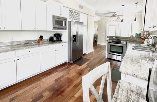 This charming 3 story cottage is located in the beautifully landscaped and gated community of Calypso Pointe. On the first level you will find a large open living room, game/poker table, dining area and fully equipped kitchen with granite counter tops and stainless steel appliances. Just outside the dining area french doors is a covered outdoor living area with a flat screen TV. "Sea Breeze" also features a king guest bedroom on the main floor with a custom built, pull out trundle cot. This room has brand new mattresses, new decor, new bedding and a wall mounted flat screen tv with an amazon fire-stick. The guest bathroom with shower is right off from the living room area. The second level features an en suite king master with wall mounted flat screen and a bathroom with a dual sink vanity, large soaking tub and walk in shower. The bathroom gives access to the second level covered deck with table and 4 chairs overlooking the back yard and outdoor gathering area. The guest bath with walk in shower is just a few step down the hall from the laundry and the guest queen bedroom which has access to the second level covered deck. The queen bedroom also has a flat screen tv. The third level is a tower sleeping area great for kids and is filled with wall to wall windows, a mounted flat screen tv, a queen platform bed and a twin daybed.