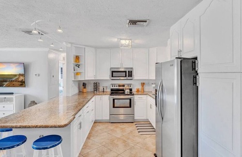Nautical themed waterfront villa on the nicest street in the city. Watch boats go by with coffee on the 70' dock, join them by renting our boat, or get on the water using our complementary paddle boards & kayaks. Split floor plan and enclosed patio complete with arcade games/foosball overlooking backyard. Grill out under the open back patio watching your favorite team on our outdoor smart TV. The heated pool encourages socializing with various seating plus a large hot tub. 3 miles to the beach!