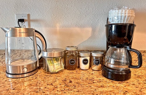 Upstairs there are 3 spacious bedrooms. The Sunshine Room is brightly decorated with an en-suite bathroom featuring his & hers sinks and a shower. Down the hallway, the Coastal Room and Evergreen Room share a bathroom with a tub/shower combination. The laundry room on the second floor is stocked with laundry detergent, dryer sheets & dryer balls for your use.