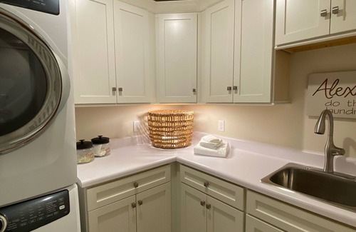 Take the stairs or the elevator ( Geriatric use only children under the age of 16 are expected to be accompanied by an adult at all times additional deposit for elevator use ) to the second floor where you open to an additional living space perfect for gatherings with a wet bar, large entertainment area, full bathroom and two balconies both over looking the pool and spa deck below. Just off the upstairs living, king and queen master suites both with private baths & walk in closets await. The master King opens to overlook the pool area below with a private balcony. Additional queen and twin bedrooms share a full bath along with the bunk room. The bunk is suited for younger children only. This is a custom bunk room with higher bunks on top. Not suited for littles and a weight capacity of 120lbs max. Please contact us for more details or see specific rooms. A laundry center adjacent to the full hallway bath completes the upstairs living area.