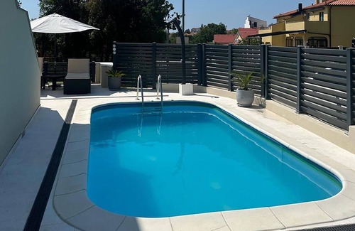 This modern designed vacation home with pool is located in Betiga. It is designed in such a way that there is a combination of two spacious apartments connected by external communication. Thus, it is ideal for a vacation with two families or a group of friends who want to spend their vacation together and still have their privacy. The units each have spacious open-plan living areas, a bathroom, a toilet and two bedrooms. The house also has two lovely terraces where you can enjoy your first morning coffee. There are beaches close to the property where you can spend wonderful sunny days swimming and sunbathing. During your stay, we recommend that you visit the city of Pula and its arena, where many concerts and other events take place during the summer months, such as the Pula Film Festival. For nature lovers, we recommend a visit to the Brijuni National Park, which will amaze you with the landscape and the animals that live there.