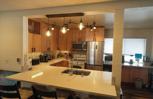 Modern kitchen with heated floors, 3 smart TVs with Netflix, wood burning fireplace, best Wifi service in Truckee. Desks in 2 of the bedrooms and space to WFH.