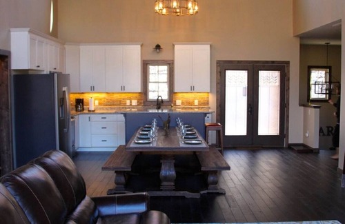 Head upstairs to the main room in the lodge, featuring a floor to ceiling stone fireplace (gas), 24' vaulted, gorgeous tongue and groove ceilings and beams, tons of sky high windows, and a kitchen with granite countertops, copper sink, and all new appliances, cookware, and dinnerware.