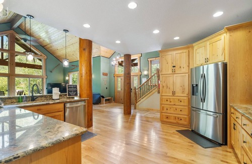 As soon as you walk in through the foyer you are greeted by an impressive, expansive great room with 20ft ceilings where you can entertain your family and friends! Gather around the wood burning stove, take in the beautiful forest views from the large picture windows, or cuddle up for a movie night in front of the 75” QLED TV- there’s ample room for all!