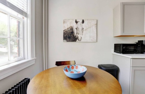 This historic gem is a few blocks in either direction from the State Capitol and downtown Frankfort. The 1930's brick building is stylishly renovated and historically preserved. This one-bedroom apartment has a separate living room and a bedroom with queen-sized bed and fluffy linens. The carefully restored Art Deco bathroom has hotel-quality towels. The freshly remodeled kitchen invites you to sip coffee. Blackout curtains and sound-insulated doors will help you sleep peacefully.