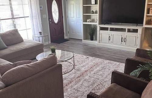 This 4-bedroom house is perfect for your escape to Tuscaloosa. With 2 living space’s, 1 king bed and 3 queen beds, this charming property offers WiFi, AC, heating, and a washing machine. Experience the magic of Tuscaloosa at our house.