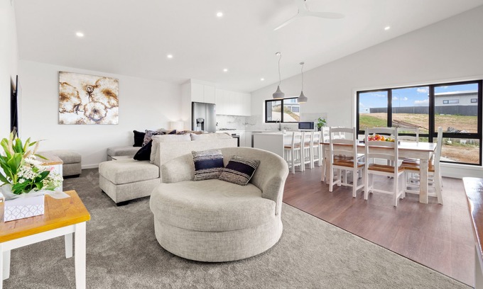 Welcome to our newly built architectural luxury spacious 4-bedroom home, Sentinel Chalet 12A. All features carefully chosen to ensure your time in Jindabyne is spent in complete comfort year-round. 5-minute drive or 15-minute walk to town. The north facing living room is drenched with sun keeping the chalet warm and cozy. 3 alfresco dining area's to entertain. Perfect 2 families or large groups. Enjoy adventuring the Mountain Bike trails, Ski Resorts, Fishing & Water sports on the lake.