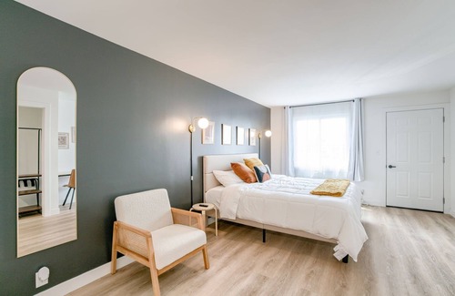 Step into chic comfort as you sink into a relaxing king-size bed with oversized pillows. Stay connected with complimentary WiFi, and whip a quick meal on your electric stove top and kitchen essentials. With a sleek full-size bathroom equipped with a hair dryer and towels, a single-serve coffee maker, a functional desk, and a mini upright refrigerator with freezer, your perfect blend of relaxation and productivity is ready and waiting.