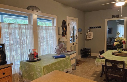Three bedrooms (two with Queen Beds and one with 2 twin beds) and 2 bathrooms (one on the first floor and one upstairs) provide for a comfortable stay for up to 6 people. Fully equipped kitchen allows eating at home if you wish. Your at-home dining area choices include in the kitchen or on the front porch or even the original "formal" family dining room.