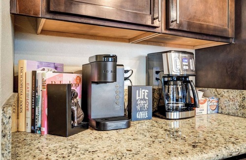 Very well equipped kitchen with refrigerator, stove, microwave, dishwasher, toaster, air fryer, waffle maker, panini maker, blender, food processor, pots, pans, cups, plates, utensils, Keurig pod coffee maker, and regular drip coffee maker.