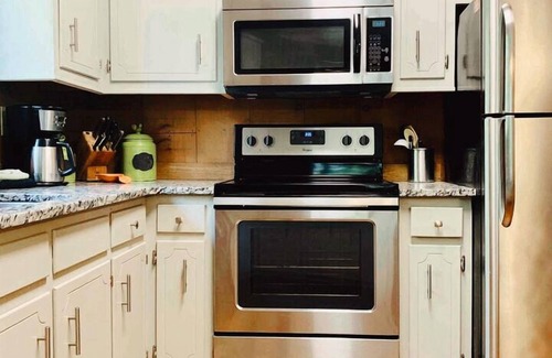 The roundhouse has 3 bedrooms all located on the main level. The master bedroom has a king size bed with 4" memory foam topper, en-suite bathroom and your own private screened porch. There are two additional rooms with queen size beds & a full bathroom with hair dryer. The great room features an oversized Pottery Barn couch, stone fireplace, Roku TV, & charging station for guest's convenience. The kitchen has granite counter tops & stainless steel appliances: oven, stove, fridge/freezer with ice maker, microwave, & dishwasher & enough bar seating for each guest. The kitchen is equipped with everything needed to whip up the perfect meal. There is a crock pot so you can come home from a long day with dinner ready. Main level porch has a gas grill, outdoor furniture and picnic table for outdoor dining.