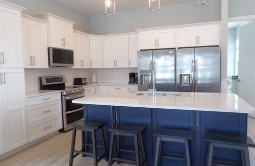 - Kitchen: Spacious gourmet kitchen. Large kitchen island breakfast bar. Quartz countertops. Stainless-steel appliances. 2 Refrigerators with ice makers. Electric range with cooktop. Dishwasher. Microwave. Crockpot. Blender. Toaster. Stock pot.