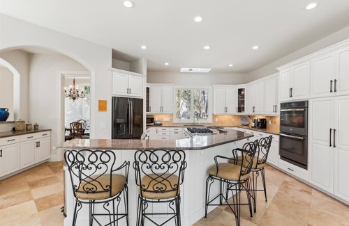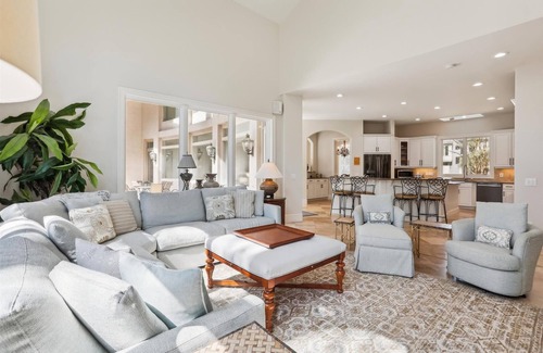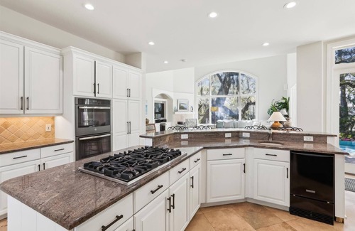 To the left of the entrance is the amazing kitchen, fully equipped with stainless steel appliances and tons of counter space making family meals a breeze! The formal dining room has a round glass-top table with seating for 10. The large living room has vaulted ceilings and large windows that allow a lot of natural sunlight to stream through and also overlooks the pool and lagoon. The living room has a 65" SMART TV, large sectional sofa and three arm chairs making it the perfect spot for movie nights for the whole family!