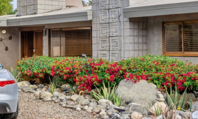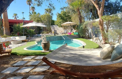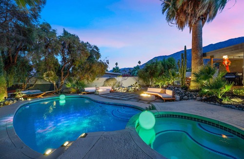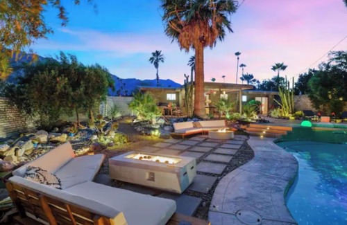 Welcome to a stunning 1960s mid-century modern home, nestled in the heart of Palm Springs, where tranquility and sum movie magic bring you a taste of Frank Lloyd Wright-inspired architecture. This architectural gem seamlessly blends vintage charm with contemporary comforts, a truly unique vacation experience