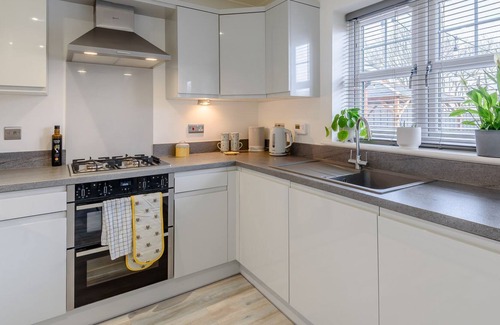 Bedroom 3: Kingsize (5ft) Bed, Smart TV Ensuite: Cubicle Shower, Heated Towel Rail, Toilet. Gas central heating, gas, electricity, bed linen, towels and Wi-Fi included. Travel cot, highchair and stairgate; available on request. Welcome pack. Lawned, enclosed back garden with patio, sitting-out area, garden furniture and BBQ. Hot tub for 6 (private). Private parking for 3 cars. No smoking. . This lovely modern holiday home is set on the edge of Woodhall Spa just a half mile stroll back into the centre of this popular spa town.