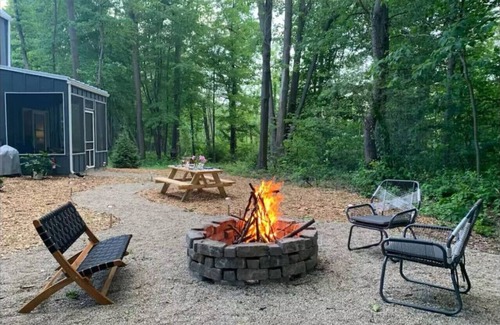 Only an hour drive from Chicago, this lovely retreat was born out of our desire to share our love of nature and connection with anyone who needs a break from the intensity of city life. The space is designed to provide a sense of peace, calm and joy by creating all things cozy...from super-plush throws and pillows, cozy robes, to sweet little reading nooks with woodland views out of oversized picture windows in each bedroom. Relax with a cup of tea or coffee from the refreshment nook on our quaint screened-in porch. Cuddle up in front of our electric fireplace and watch a film together in the media room. Round out the perfect day relaxing by the fire pit under the stars.