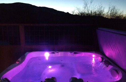 Accommodations include one bedroom with a queen-size log bed and two futons, two full baths, fireplace, hot tub, kitchenette, and a loft with an additional queen bed and a sleeper sofa.