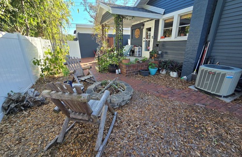 Stay comfortably in this fully renovated 1921 bungalow in Historic Old Northeast St. Petersburg. This is a split floor plan, with the master in the rear of the house, and the second bedroom in the front. Just a couple of blocks from the Coffeepot Bayou, observe manatees and dolphins or walk to local restaurants and bars. Tree-lined, original brick streets pave the path in this quiet, peaceful family-centric neighborhood. A 5-minute Uber will get you downtown, or 15 minutes to the world-famous St Pete Beach. The master bedroom features a soothing king-platform bed with the most comfortable mattress imaginable, and the second bedroom is equipped with a fantastic queen bed with a memory foam mattress. Enjoy the brilliant amenities like high-speed WiFi, AC, 4K HDTV's in the bedrooms, 8K HDTV, and full Dolby Digital 7.1 Surround in the living room. Washer/Dryer combo in the fully equipped kitchen, gas stove, Ninja air fryer, microwave. The master bath has a rain shower and hand-held handpiece, while the second bathroom offers an original clawfoot tub, with Epsom Salts to soak. We'll be available to answer any questions while you stay at our place.
