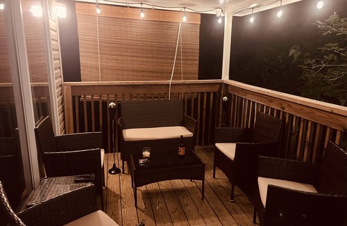 Fully stocked kitchen with cookware, microwave, dishes, silverware, full stocked barware, wine opener, beer opener, basic spices, 12 cup coffeemaker with filters and regular & decaf coffee provided. 4 burner gas grill on furnished covered deck with string lights.