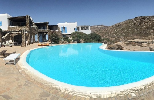 it offers the ideal location for relaxed holidays for families or groups of friends. Situated in the south part of the island it forms part of a small development called Agrari Village constructed in 2009 with high architectural standards. Perched on the slopes of the hill overlooking Agrari bay it enjoys stunning view of the wildness of the mykonian lanscape
