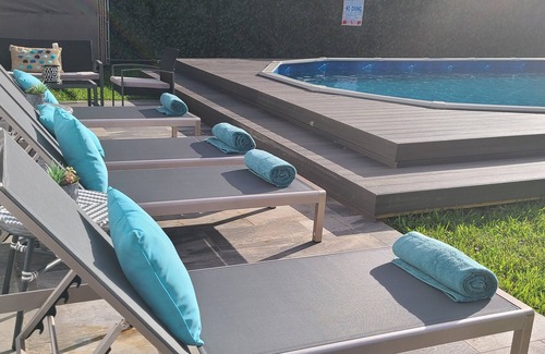 Private back yard ,with outdoor seating ,large hot tub . large pool custom kitchen fully equipped.