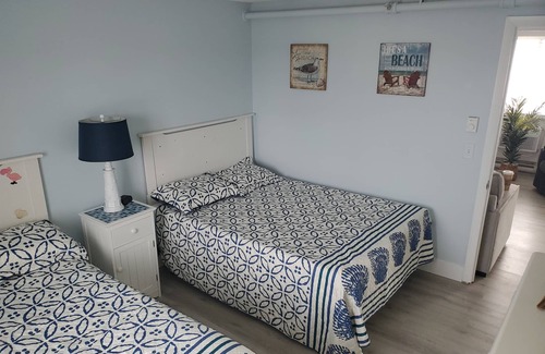 This cozy condo sleeps 6 comfortably - 2 bedrooms (1 queen & 2 full) and a king size pull-out couch ( linens/towels not provided). 1 bathroom. All furnishings in condo have been updated (mattress, couches, tables etc), full kitchen. Amazing ocean views - Sit on the deck and watch the fireworks every Thursday night. Off street parking, laundry services, heated pool, flat screen TV & Wifi, 4 beach chairs. Half mile walk to pier, amusement park, shops, restaurants. No pets... Oct-may 3 night minimum