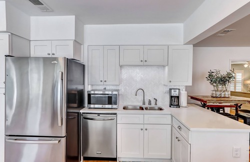 The open floor plan kitchen has a gas cooktop on the island and everything you need to prepare fun meals. The kitchen has a bar with seating for four and a separate dining room furnished with a farmhouse table that seats six for family dinners. A high-top table that seats four in the living room provides additional seating for meals or for board games.