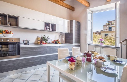 The fully equipped kitchen includes an induction cooktop, electric oven, refrigerator with freezer, dishwasher, toaster, kettle, American coffee maker and moka pot. Every detail has been carefully chosen for both style and practicality, from coordinated tableware to elegant ceramic countertops.