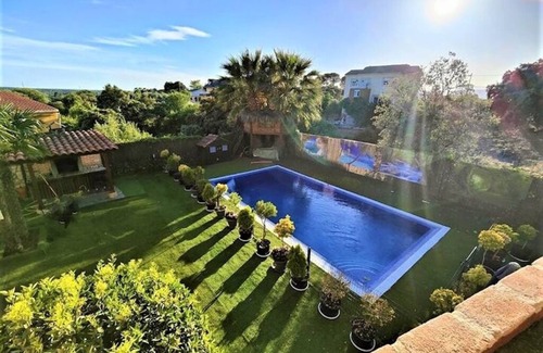 Three-story villa with independent entrances, 6 bedrooms, 9 beds, two bathrooms with shower, one bathroom with a hydromassage tub, and a guest toilet. A living room with a sofa and multiple tables, a wine cellar, a fully equipped kitchen, TV, garage, air conditioning, and a private pool. Spacious garden with a barbecue area.