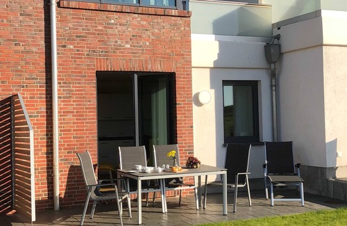 The luxurious apartment has about 55 square meters and is located on the ground floor. The living area with open, fully equipped kitchen and dining area has access to the terrace and an unobstructed view of the North Sea and the green Oberland. A second terrace is located on the southern sun side of the apartment. Bedroom has a comfortable double bed, shower room and toilet are separate. Wi-Fi, TV and radio / docking station are available, sheets and towels are included and are changed for longer stays. There are washing machines and dryers available for a fee (coins) in the basement.
