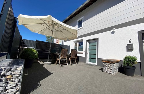 The apartment for up to 6 people has its own entrance, patio with seating and parking space. A barbecue is available in the patio. The 110 m² living space are divided on 2 floors (entrance area on the ground floor all other rooms in the 1st. OG). In the spacious entrance area there is the possibility to park bicycles or prams. In the 1. Upstairs there are 2 bedrooms, the living-dining area with open kitchen and the bathroom. The apartment is equipped with a large living area which offers two more beds, satellite TV and a pellet stove and a fully equipped kitchen with dishwasher, stove, fridge and freezer, coffee maker, Senseo, microwave and toaster. The two bedrooms are equipped with a double bed 180x200 cm and a double bed 160x200 cm, as well as wardrobes and storage space. They therefore offer enough space for families. The bathroom has a shower, toilet, sink and hair dryer. The sofa in the living room can be used as additional sleeping space and has a lying area of 1.50 mx 2.45 m. Bed linen, towels, tea towels, soap, dish soap and detergent tablets are included in the price. Free wifi is available throughout the apartment.