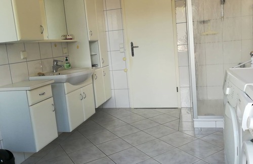 In the bathroom with shower there is also a washing machine and dryer. A hairdryer is provided, as are towels. The upper apartment has a separate entrance. Bicycles can be stored in our garage, where the batteries for e-bikes can also be charged.