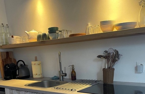 The kitchenette is equipped with a stovetop and a refrigerator, as well as a coffee maker, an electric kettle, and cookware. Bathroom amenities include a hair dryer, towels, and toilet paper. And because there's a washer and dryer, you can go a bit lighter on your packing. Other amenities include bed sheets and an ironing board.