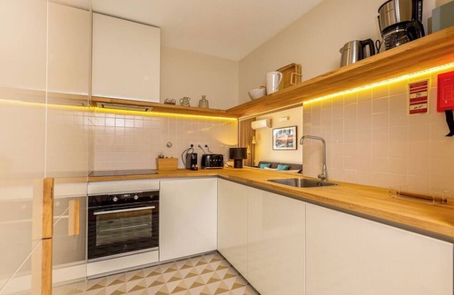 The kitchen itself is tidy and well-equipped, providing everything you need to prepare your favourite meals during your stay. With the mess of cooking concealed, you can fully appreciate the sleek and uncluttered aesthetic of the apartment.