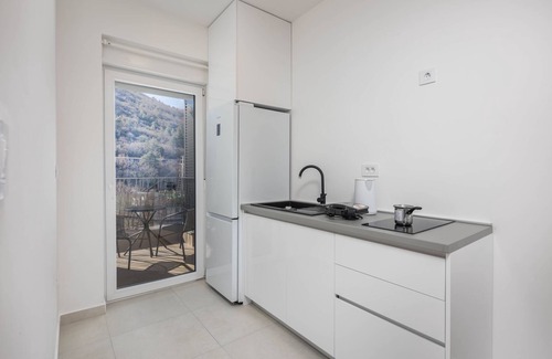 Nestled along the coast of Istria, this modern apartment is just 30 meters away from the shores of the Adriatic Sea. A beautiful one-bedroom apartment on the second floor, it has stylish interiors and comfortably accommodates four guests. The bright living room has an open kitchen with a glass door that opens onto the balcony. An elegant dining set up in the living room along the kitchen complements the interiors.