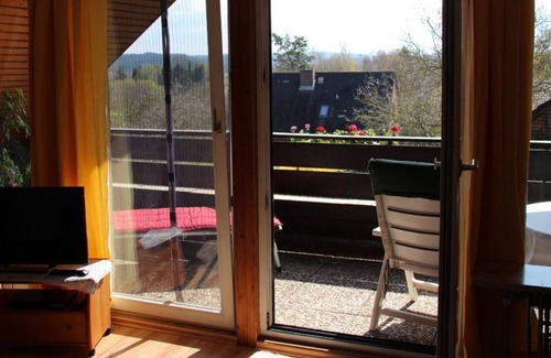 The 2 bedroom apartment is located upstairs and has 60 m². A room is a combined kitchen and dining room. In addition, here is a pull-out couch for 2 available, which indeed has a hard spring core, but is also suitable as a place to sleep for one person. Adjacent to the kitchen is the bathroom with shower and bath. The second room is a combined living room and bedroom with double bed and two bunks, a small seating area and a flat-screen TV (satellite channels). Through the large window front and the adjacent, large and covered south-facing balcony you have a wonderful view of nature and the garden. Your four-legged friend can be booked for the price of € 10.00 per stay, WiFi is available free of charge. Bicycles can be safely stored in the carport after consultation.